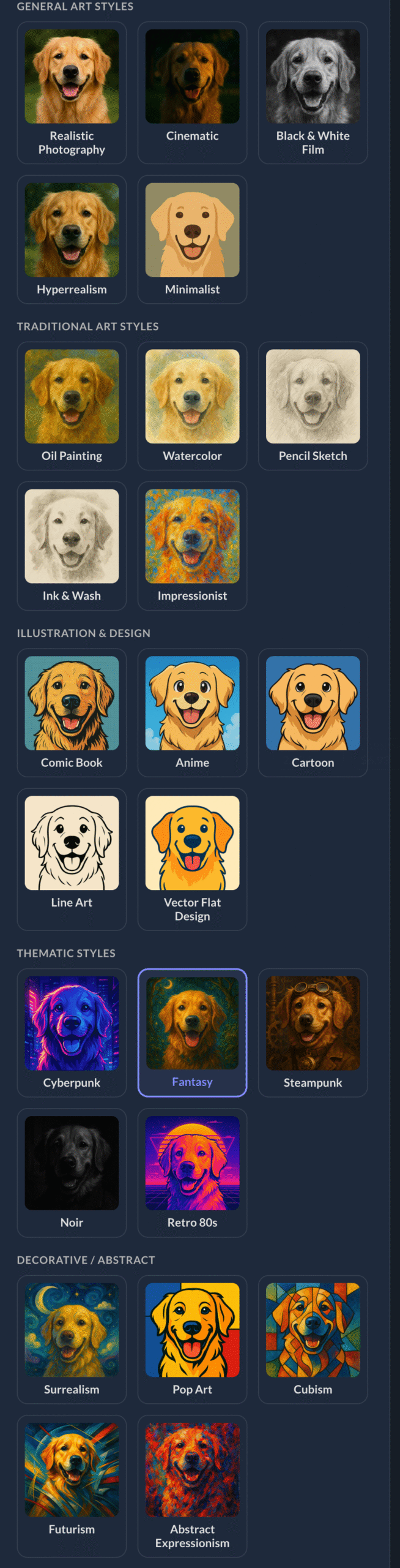 Image Studio is an AI image generator that lets you create visuals in any style you want: watercolor, fantasy, minimalist, Pixar-inspired, cyberpunk, pop art, black & white photography, and so much more.